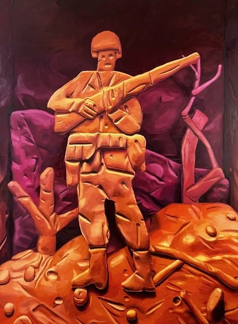 White, who has shown with Bill Arning Exhibitions since it opened in 2020, developed a labor-intensive clay-based method during his student years. He paints hand-formed figures, objects, and scenes modeled in never-dry clay, carefully recording the bumps, dents, and fingerprints that mark each surface. These traces highlight fragility, impermanence, and the constructed nature of the cultural concepts he depicts. His images build up like ideas—manipulated, reshaped, and altered over time—reflecting America’s attitudes toward the environment, food culture, peace, liberty, taxation, religion, and our competitive drives. Recurring motifs of homes, money, war, and hesitant human figures reference shared cultural landscapes shaped by projected and inherited values such as Money, God, and Masculinity. His playful touch makes difficult subjects accessible without diminishing their seriousness.